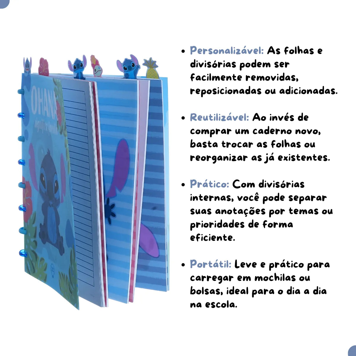 Com 72 folhas reposicionáveis, 6 divisórias exclusivas e o charme irresistível do Stitch, ele é perfeito para estudos, trabalho, planejamento pessoal ou tudo isso junto.